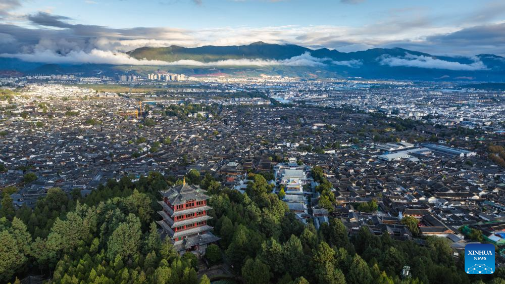 An aerial drone photo taken on Nov. 11, 2024 shows the scenery of Lijiang ancient town during sunrise in southwest China's Yunnan Province. With the goal to build a world famous tourism city, Lijiang has been improving the service in its scenic spots such as Lijiang ancient town and Yulong Snow Mountain, in an effort to promote the high-quality development of its cultural tourism market.