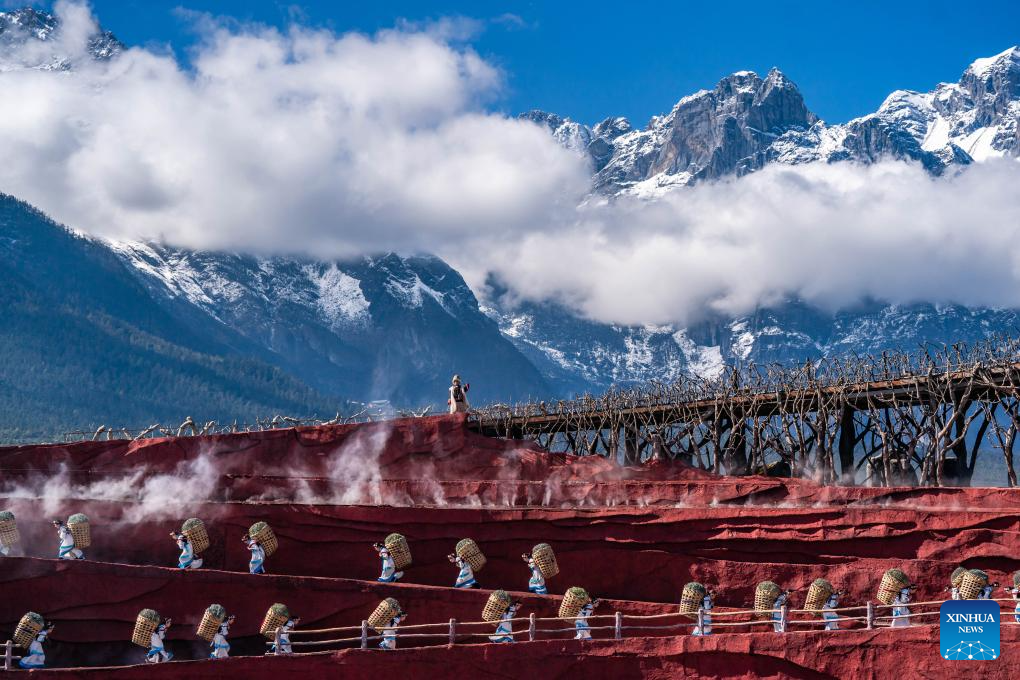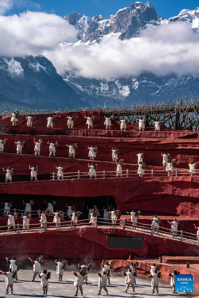 Artists perform in the outdoor musical "Impression Lijiang" at the Yulong Snow Mountain scenic spot in Lijiang, southwest China's Yunnan Province, Nov. 9, 2024. With the goal to build a world famous tourism city, Lijiang has been improving the service in its scenic spots such as Lijiang ancient town and Yulong Snow Mountain, in an effort to promote the high-quality development of its cultural tourism market.