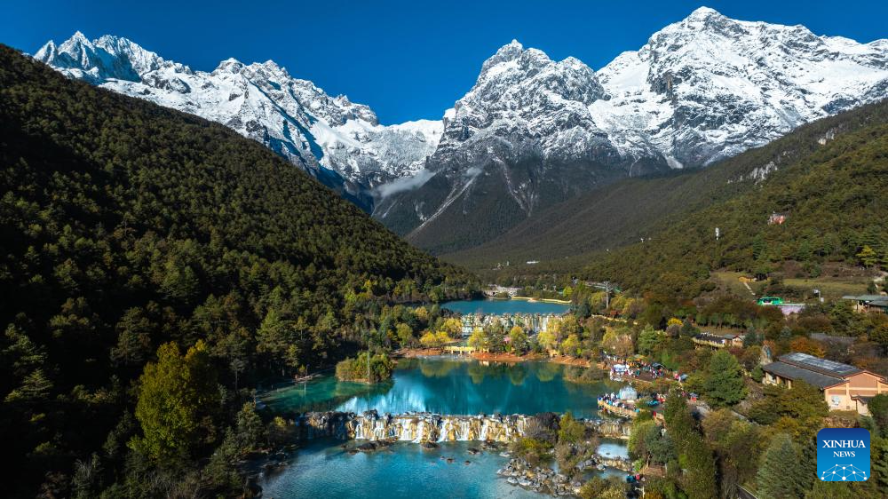 An aerial drone photo taken from Heilongtan Park shows a view of the Yulong Snow Mountain in Lijiang, southwest China's Yunnan Province, Nov. 11, 2024. With the goal to build a world famous tourism city, Lijiang has been improving the service in its scenic spots such as Lijiang ancient town and Yulong Snow Mountain, in an effort to promote the high-quality development of its cultural tourism market.