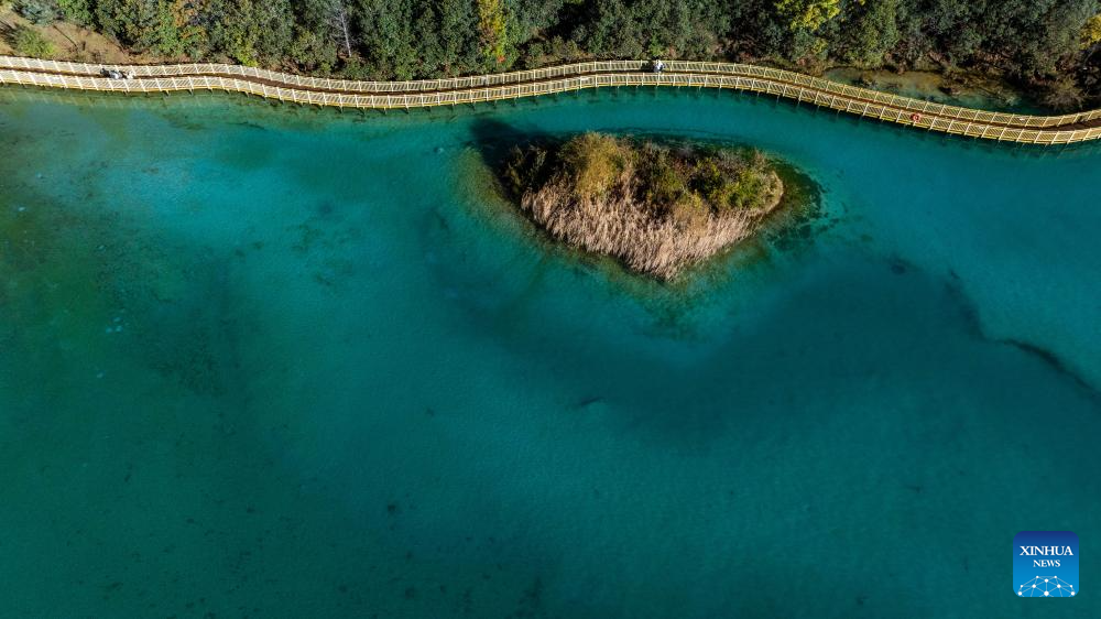 An aerial drone photo taken on Nov. 9, 2024 shows tourists visiting Lanyue (Blue Moon) Valley in Lijiang, southwest China's Yunnan Province. With the goal to build a world famous tourism city, Lijiang has been improving the service in its scenic spots such as Lijiang ancient town and Yulong Snow Mountain, in an effort to promote the high-quality development of its cultural tourism market.