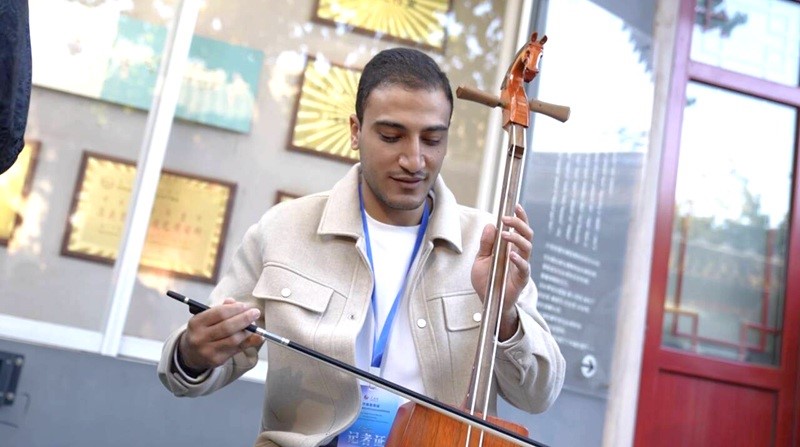 Mazen Eslam Afify Ahmed, an Egyptian journalist, tries to play horse-head fiddle, a representative musical instrument of the Mongolian ethnic group, in north China's Inner Mongolia Autonomous Region. (People's Daily Online/Yuan Meng)