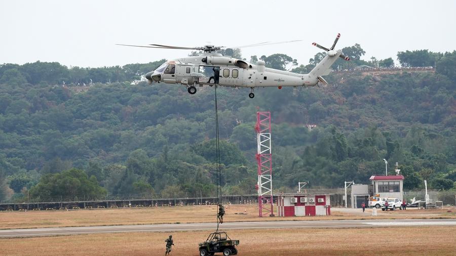 A Z-20J shipborne helicopter conducts adaptive training for the upcoming Airshow China in Zhuhai, south China's Guangdong Province, Nov. 10, 2024. (Photo by Ma Ruizhao/Xinhua)