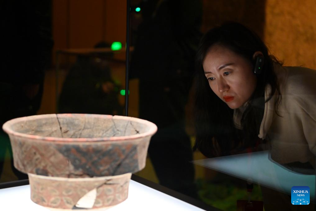 A visitor looks at an exhibit in the Taosi Site Museum in Xiangfen County, north China's Shanxi Province, Nov. 12, 2024. (Xinhua/Yang Chenguang)