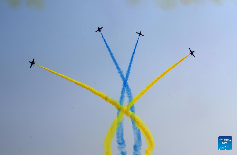 Aircraft of China's Red Falcon Aerobatic Team stage a performance during Airshow China in Zhuhai, south China's Guangdong Province, Nov. 12, 2024. The 15th China International Aviation and Aerospace Exhibition, also known as Airshow China, kicked off in Zhuhai on Tuesday. (Xinhua/Lu Hanxin)