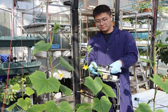 Yang Hao assesses the photosynthetic efficiency of cucumber plants in a greenhouse at China Agricultural University in Beijing. (Photo courtesy of the interviewee)