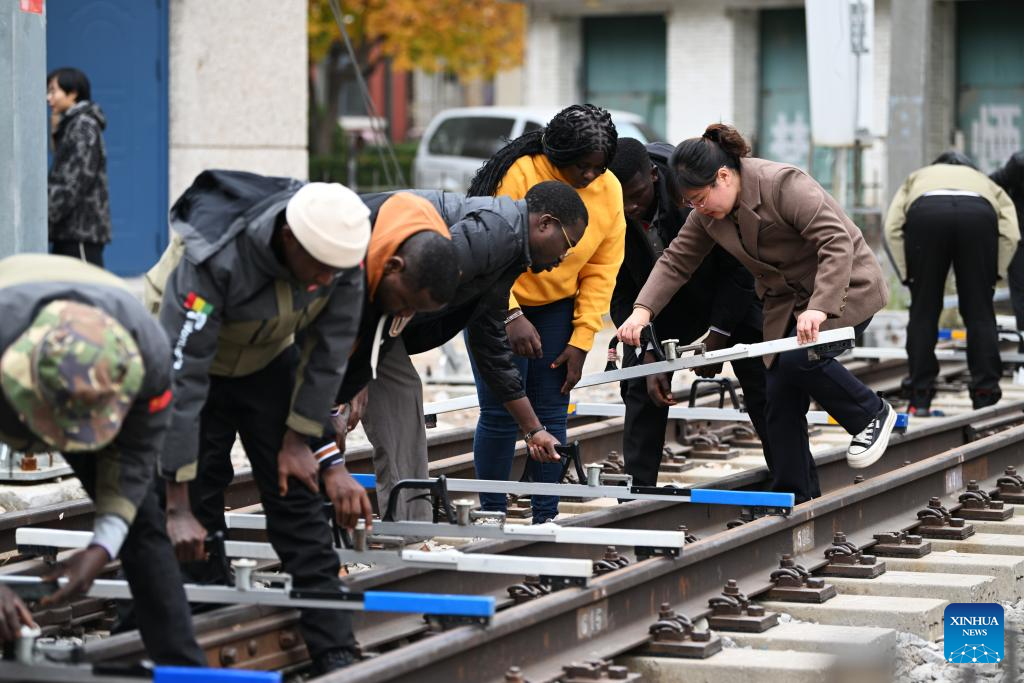 Trainees from Guinea use rail gauge measuring instrument at Tianjin Railway Technical and Vocational College in north China's Tianjin, Nov. 11, 2024.