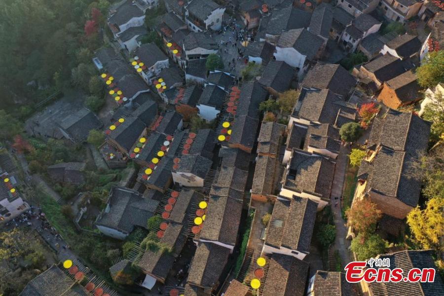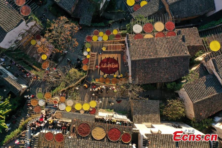 An aerial view of the unique rural tradition "Shaiqiu" at "China's most beautiful village," Huangling Village, Wuyuan County, east China's Jiangxi Province, Nov. 11, 2024. (Photo: China News Service/Liu Zhankun)