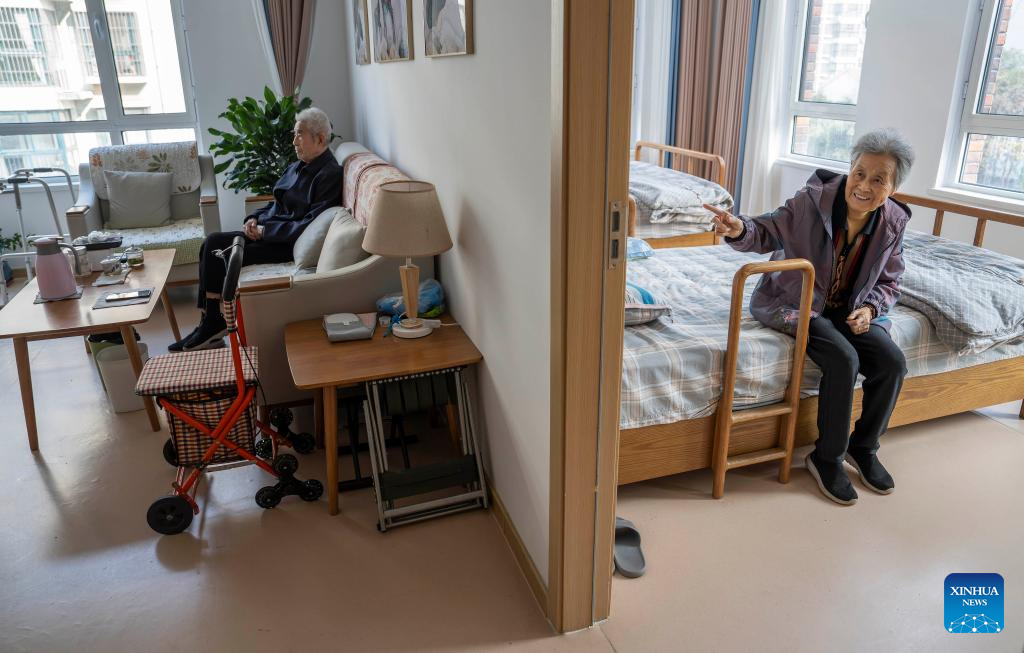 A senior couple takes a rest inside their suite at an elderly care center in Rizhao, east China's Shandong Province, Nov. 11, 2024. The city of Rizhao has in recent years been committed to enhancing elderly care services that integrate medical, fitness, and daily care through at-home and community-based facilities. (Xinhua/Cai Yang)