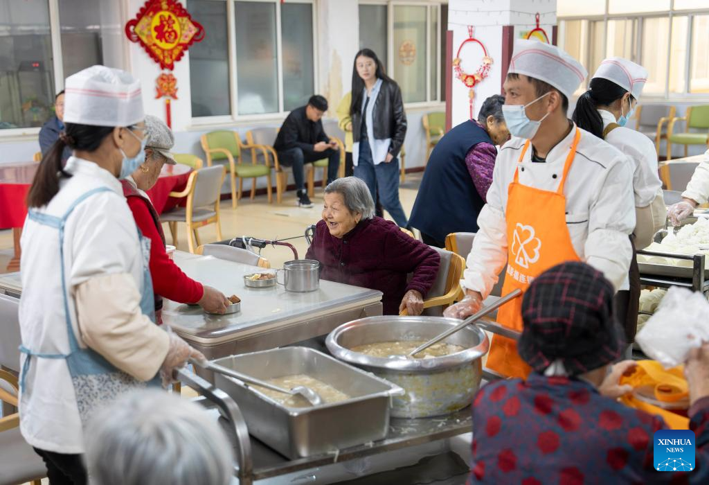 Senior residents have lunch at a residential compound featuring comprehensive elderly services in Rizhao, east China's Shandong Province, Nov. 13, 2024. The city of Rizhao has in recent years been committed to enhancing elderly care services that integrate medical, fitness, and daily care through at-home and community-based facilities. (Xinhua/Cai Yang)