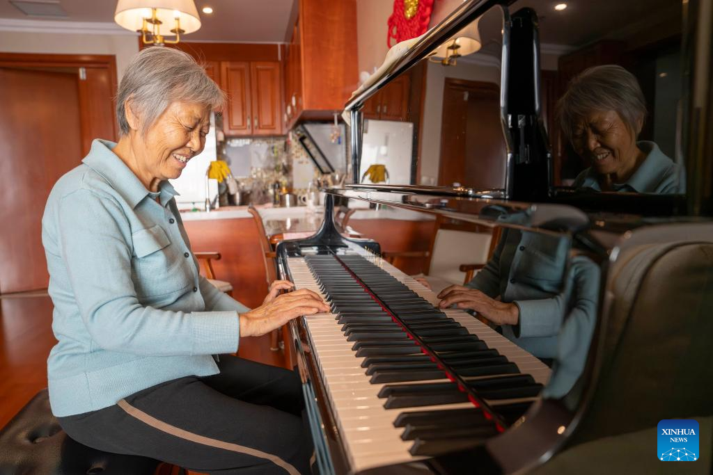 A senior resident plays piano at an elderly care center in Rizhao, east China's Shandong Province, Nov. 11, 2024. The city of Rizhao has in recent years been committed to enhancing elderly care services that integrate medical, fitness, and daily care through at-home and community-based facilities. (Xinhua/Cai Yang)