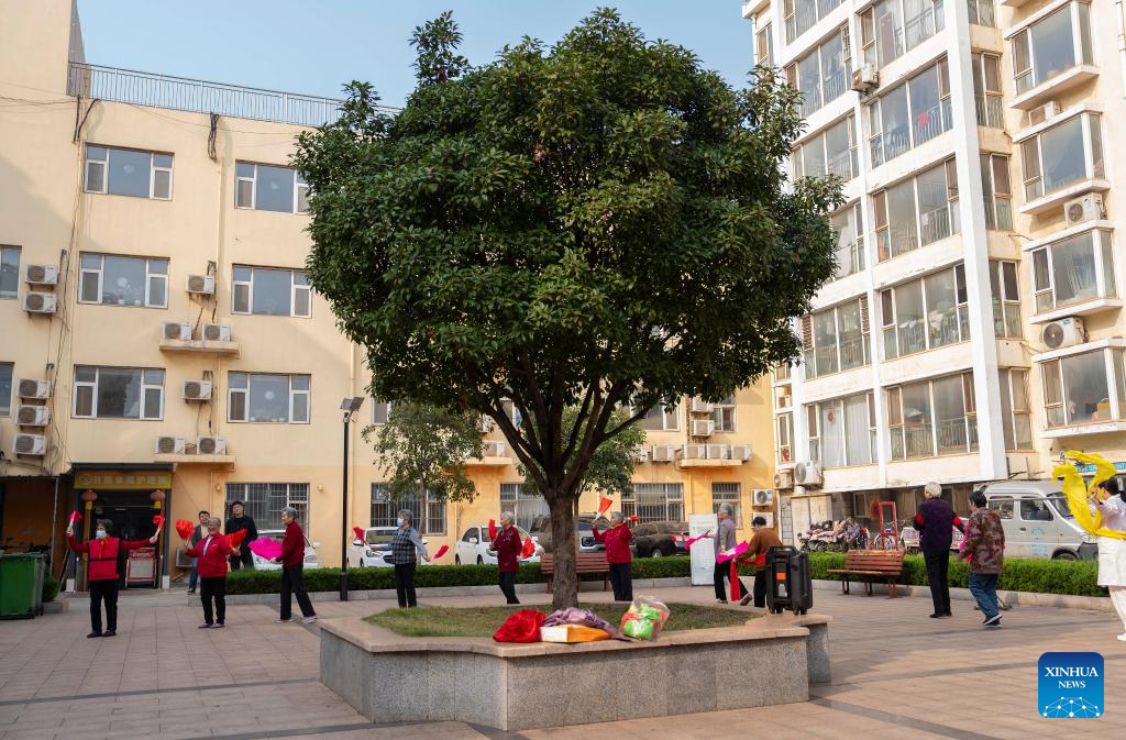 Senior residents entertain themselves with "yangko" dance at a residential compound featuring comprehensive elderly services in Rizhao, east China's Shandong Province, Nov. 11, 2024. The city of Rizhao has in recent years been committed to enhancing elderly care services that integrate medical, fitness, and daily care through at-home and community-based facilities. (Xinhua/Cai Yang)