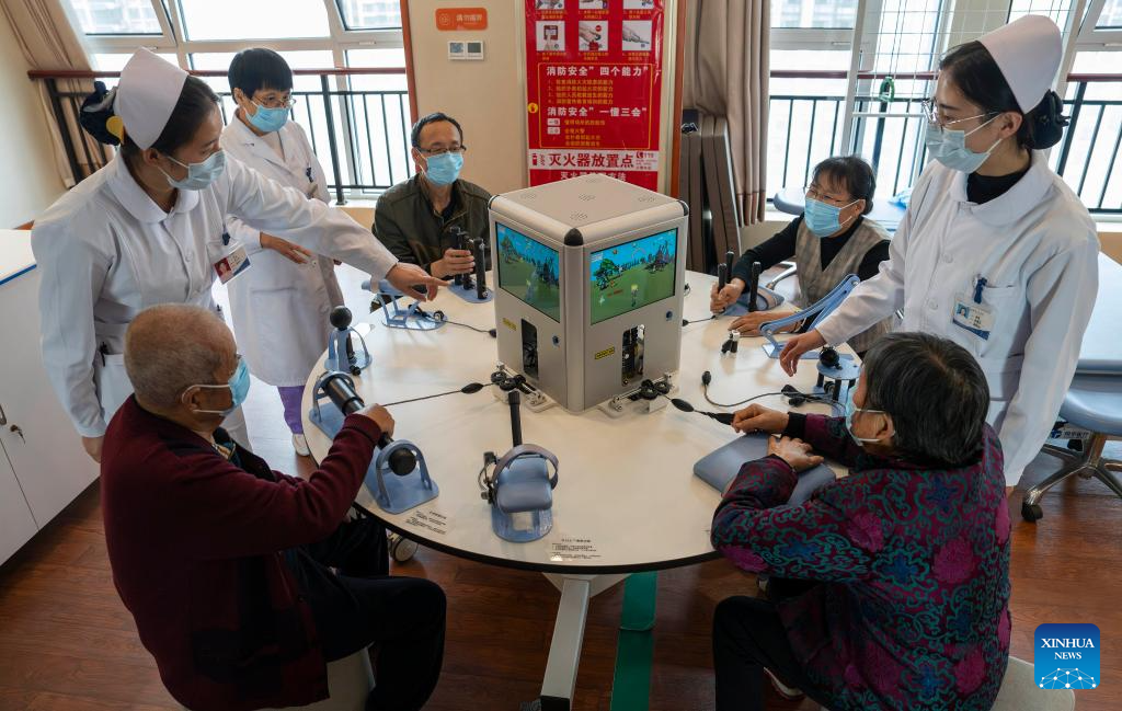 Senior residents undergo rehabilitation training at an elderly care center in Rizhao, east China's Shandong Province, Nov. 11, 2024. The city of Rizhao has in recent years been committed to enhancing elderly care services that integrate medical, fitness, and daily care through at-home and community-based facilities. (Xinhua/Cai Yang)
