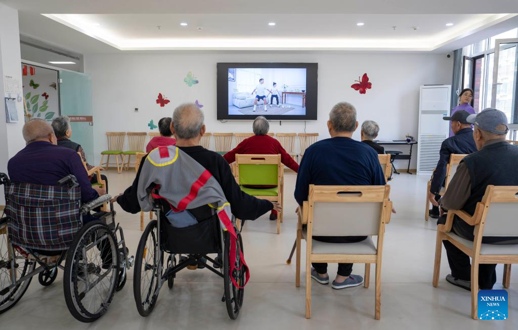 Senior residents do physical exercise at an elderly care center in Rizhao, east China's Shandong Province, Nov. 11, 2024. The city of Rizhao has in recent years been committed to enhancing elderly care services that integrate medical, fitness, and daily care through at-home and community-based facilities. (Xinhua/Cai Yang)