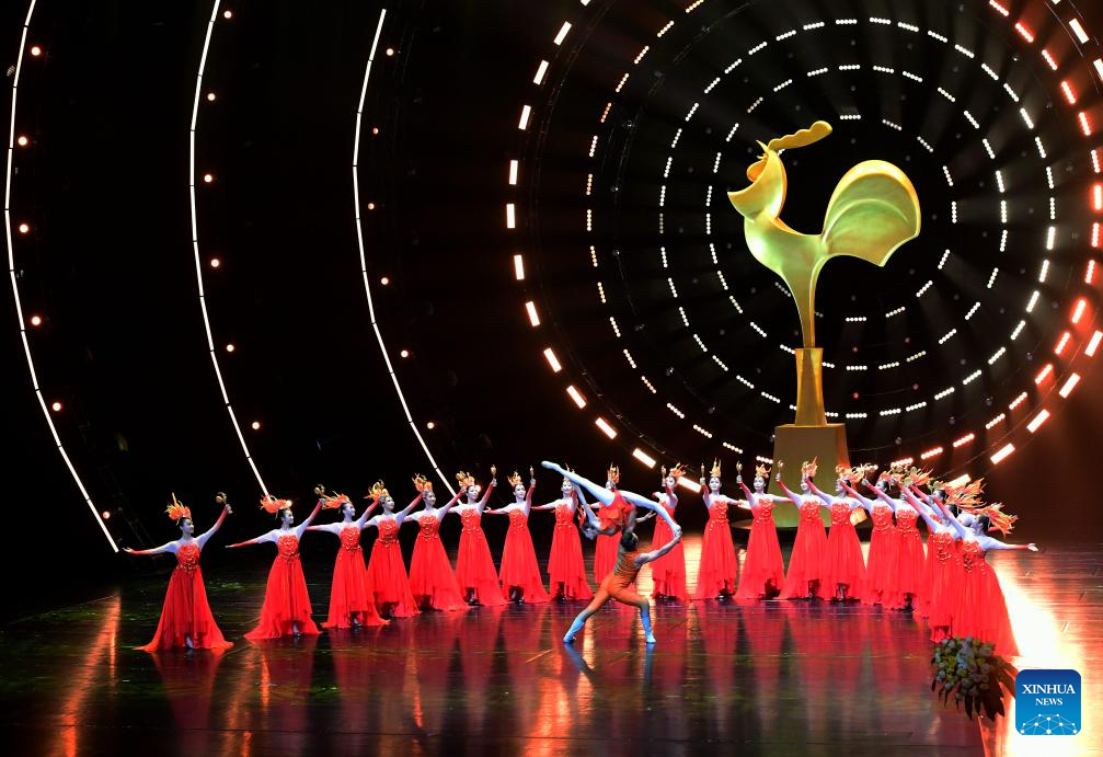 Performers dance at the opening ceremony of the 2024 China Golden Rooster and Hundred Flowers Film Festival in Xiamen, southeast China's Fujian Province, Nov. 13, 2024. The 2024 China Golden Rooster and Hundred Flowers Film Festival, which features China's top film awards ceremony, opened on Wednesday in the city of Xiamen, east China's Fujian Province. (Xinhua/Wei Peiquan)
