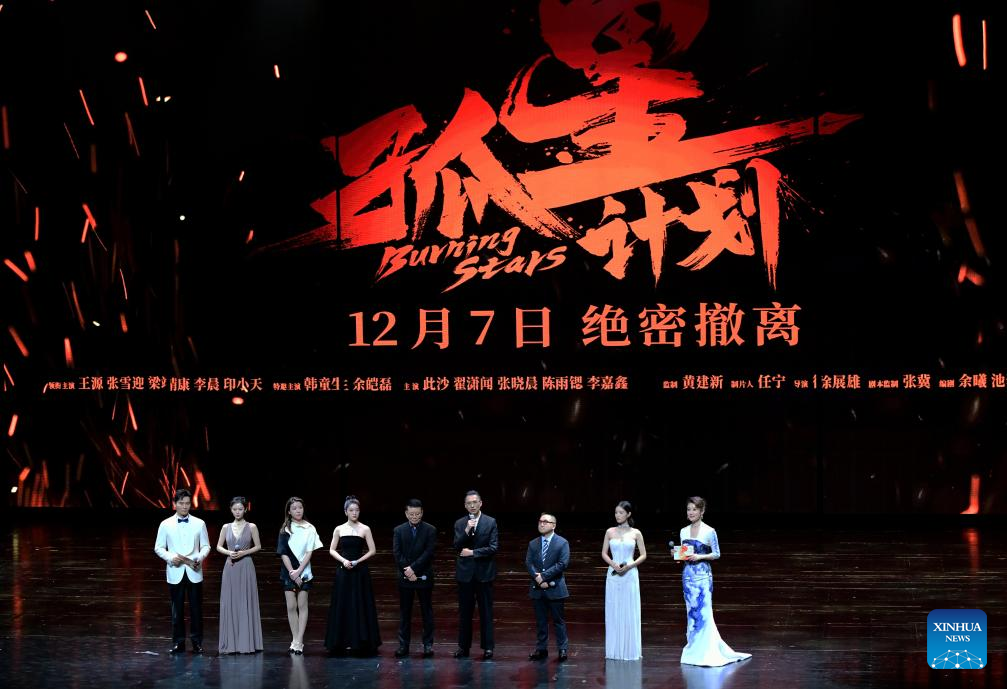 Casting and crew of the film "Burning Stars" are on stage at the opening ceremony of the 2024 China Golden Rooster and Hundred Flowers Film Festival in Xiamen, southeast China's Fujian Province, Nov. 13, 2024. The 2024 China Golden Rooster and Hundred Flowers Film Festival, which features China's top film awards ceremony, opened on Wednesday in the city of Xiamen, east China's Fujian Province. (Xinhua/Wei Peiquan)