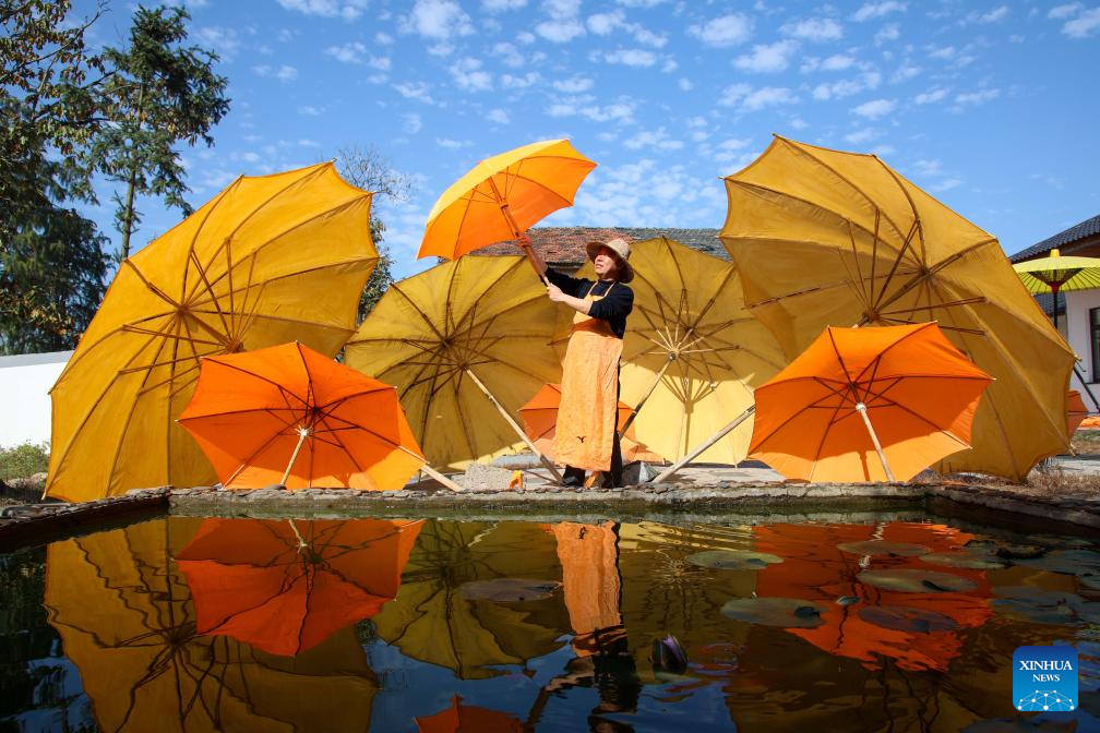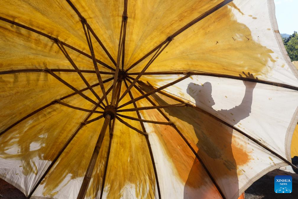 A worker airs oilcloth umbrellas in Gufeng Village of Jingxian County, east China's Anhui Province, Nov. 13, 2024. The umbrella, made of oiled cloth and bamboo frame, is a traditional Chinese handicraft. The oilcloth umbrella-making craftsmanship with 12 procedures is a provincial-level intangible cultural heritage. (Xinhua/Cao Li)