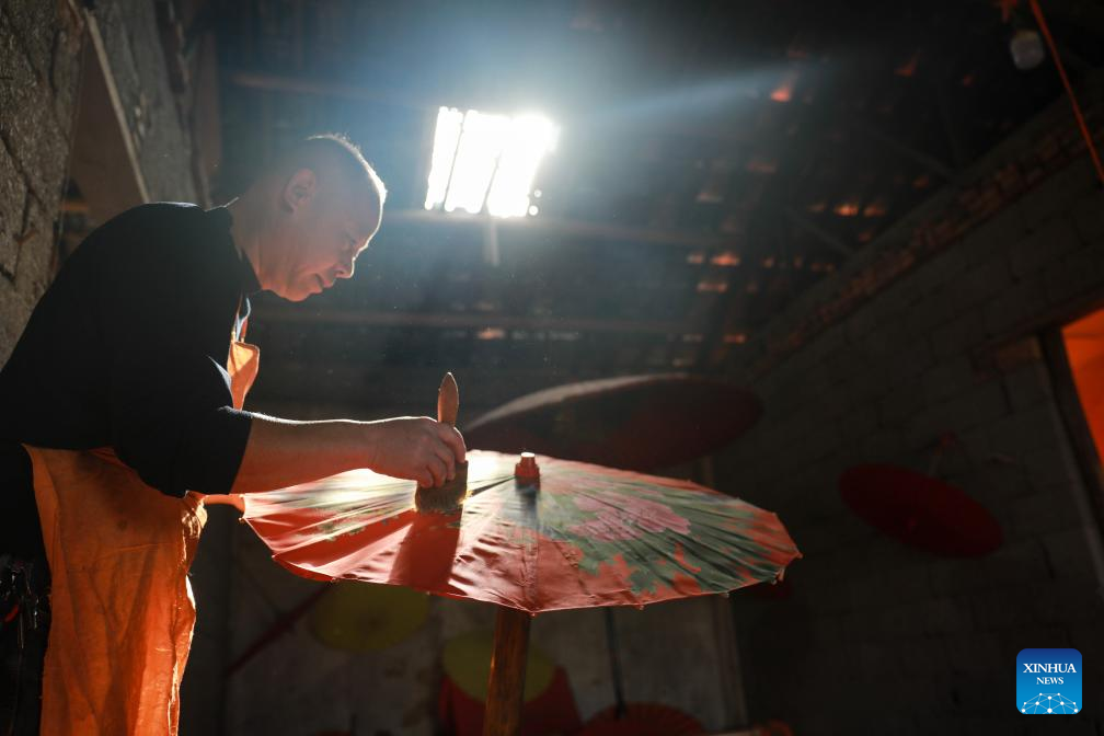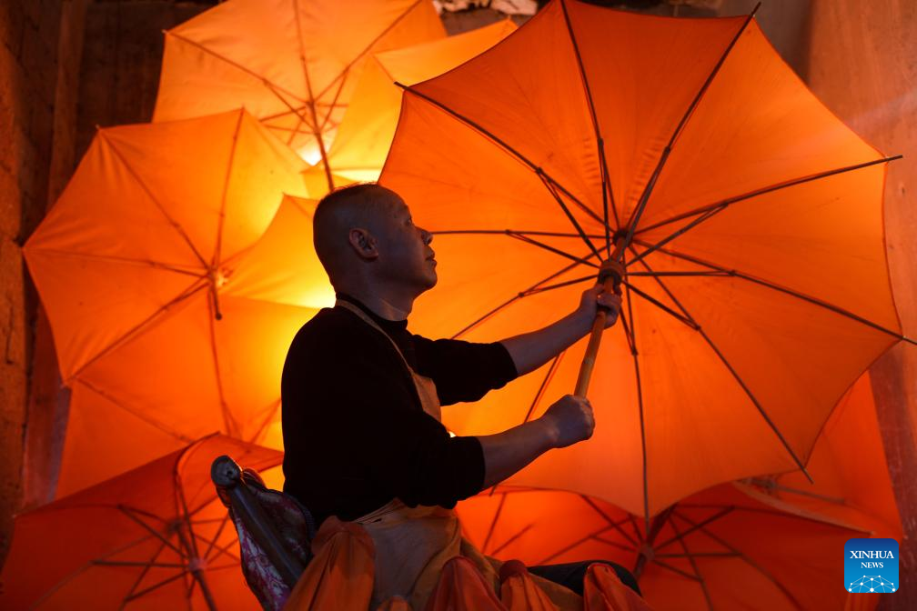 A worker makes an oilcloth umbrella in Gufeng Village of Jingxian County, east China's Anhui Province, Nov. 13, 2024. The umbrella, made of oiled cloth and bamboo frame, is a traditional Chinese handicraft. The oilcloth umbrella-making craftsmanship with 12 procedures is a provincial-level intangible cultural heritage. (Xinhua/Cao Li)