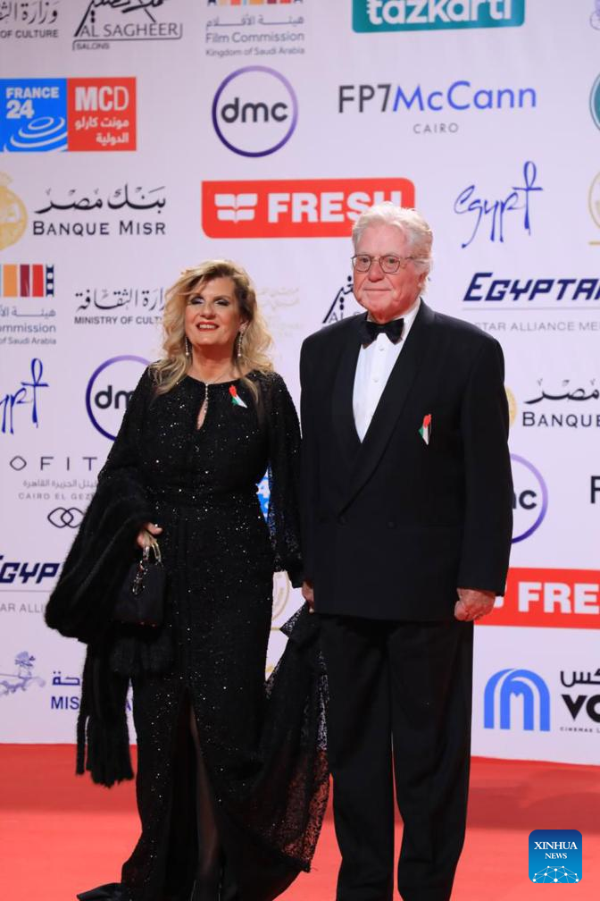 Egyptian veteran movie star Hussein Fahmy (R), the festival's president, poses for photos on the red carpet for the opening ceremony of the 45th Cairo International Film Festival (CIFF) in Cairo, Egypt, on Nov. 13, 2024. The 45th Cairo International Film Festival (CIFF) kicked off Wednesday evening at Egypt's Cairo Opera House with strong Chinese participation. (Xinhua/Ahmed Gomaa)