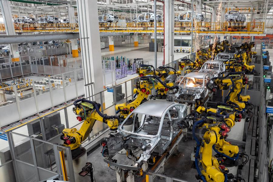 This photo taken on March 21, 2024 shows a production line of BYD, China's leading new energy vehicle (NEV) manufacturer, in Changsha, central China's Hunan Province. (Xinhua/Chen Sihan)