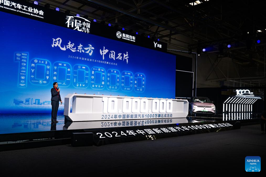 This photo shows a ceremony marking the 10 million milestone that China's annual production of new energy vehicles (NEVs) has surpassed for the first time, in Wuhan, central China's Hubei Province, Nov. 14, 2024.