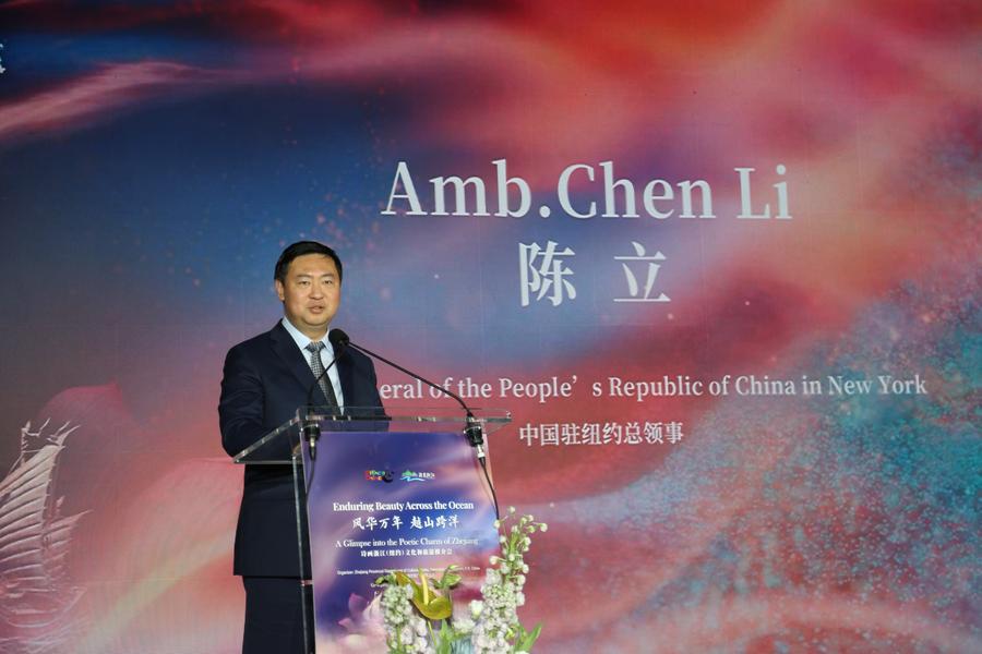 China's Consul General in New York Chen Li speaks at a tourism promotion event for east China's Zhejiang Province in New York City, the United States, on Nov. 13, 2024. (Xinhua/Liu Yanan)
