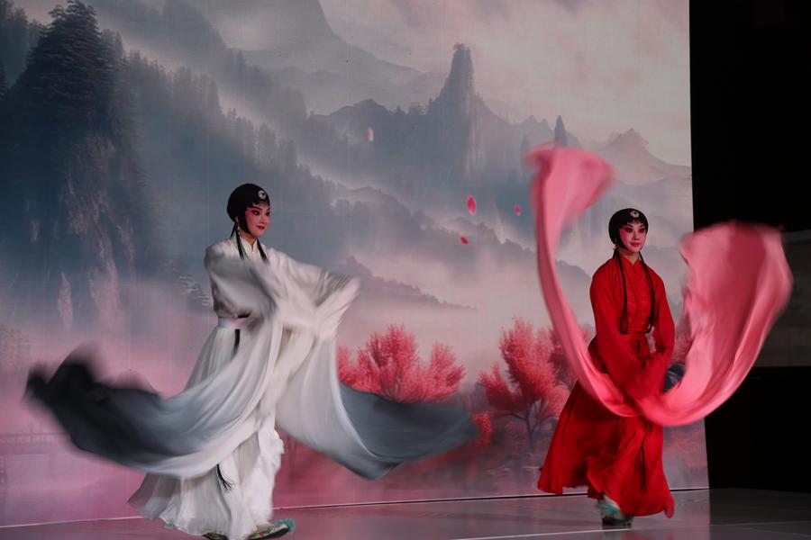 Artists perform Chinese traditional water sleeve dance at a tourism promotion event for east China's Zhejiang Province in New York City, the United States, on Nov. 13, 2024. (Xinhua/Liu Yanan)