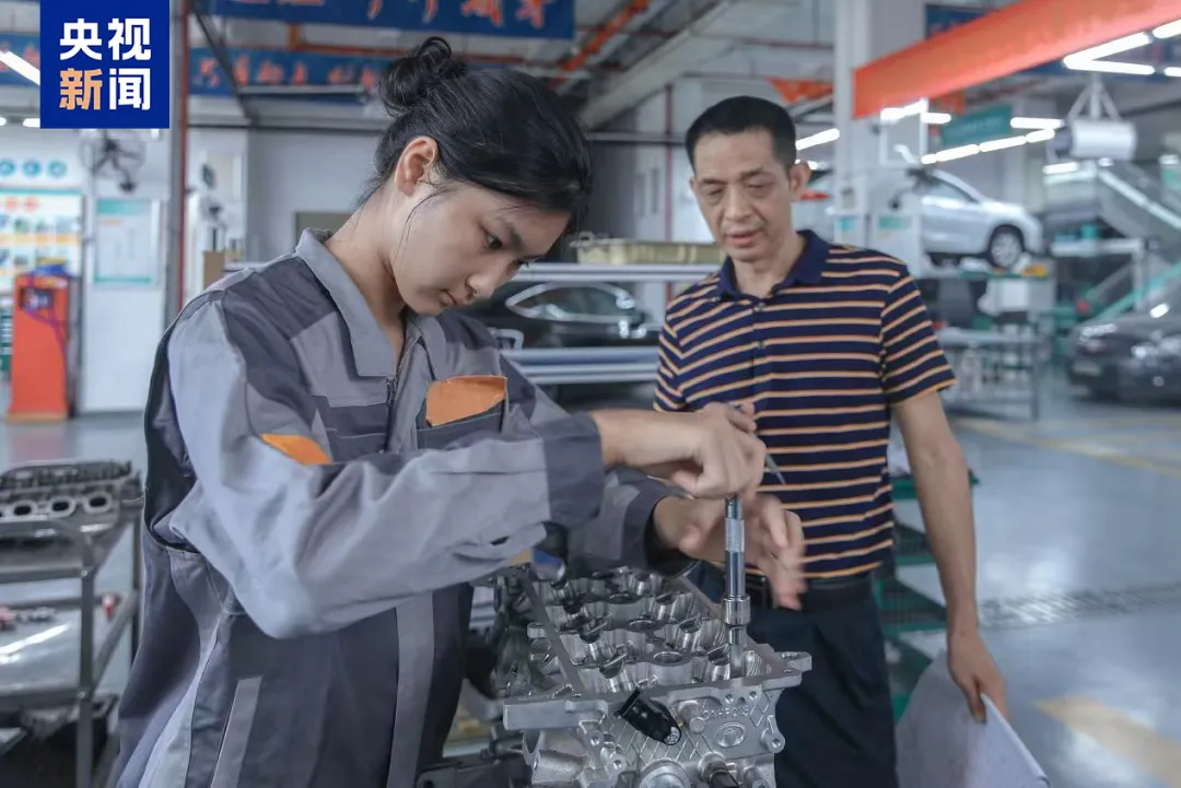 Gu Huijing (left), a post-00s Chinese girl who is widely known by Chinese netizens as "auto repair girl," receives training at the Shenzhen Second Vocational and Technical School, which is located in Shenzhen, south China's Guangdong Province. The photo was taken when she was 17 years old. (Photo/CCTV News)