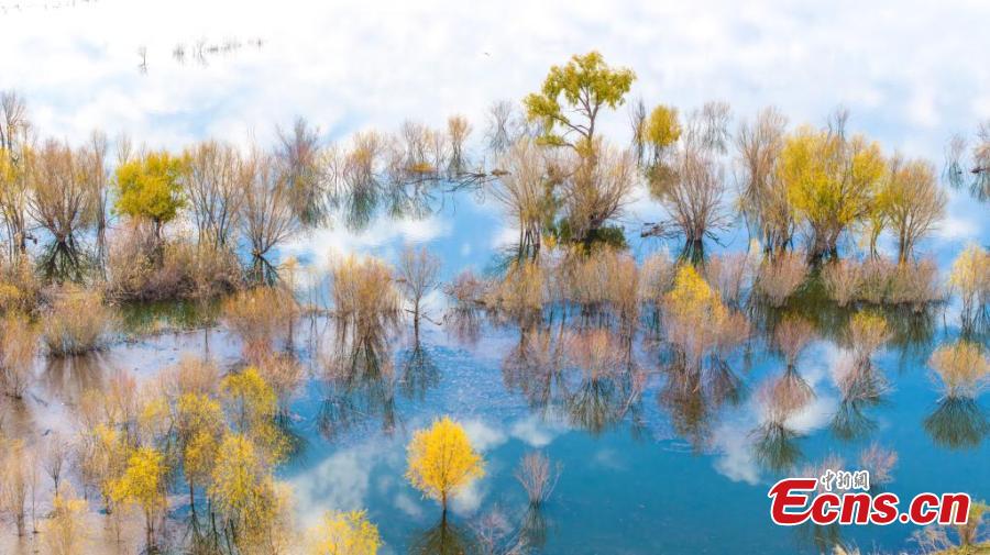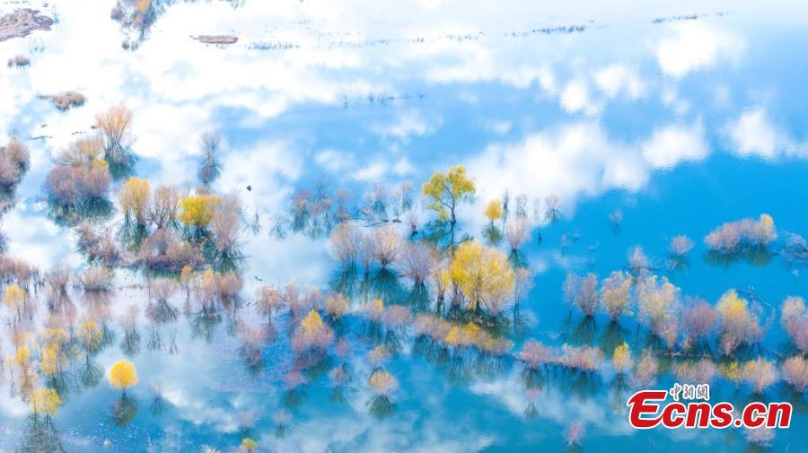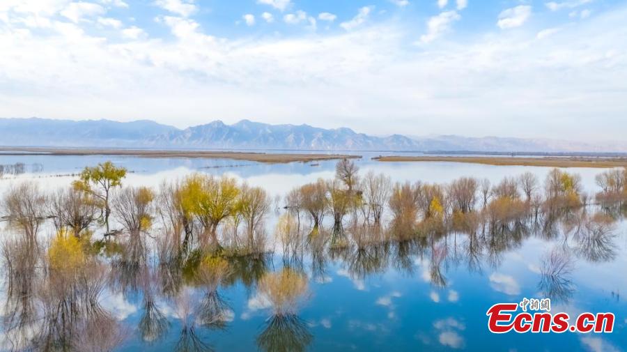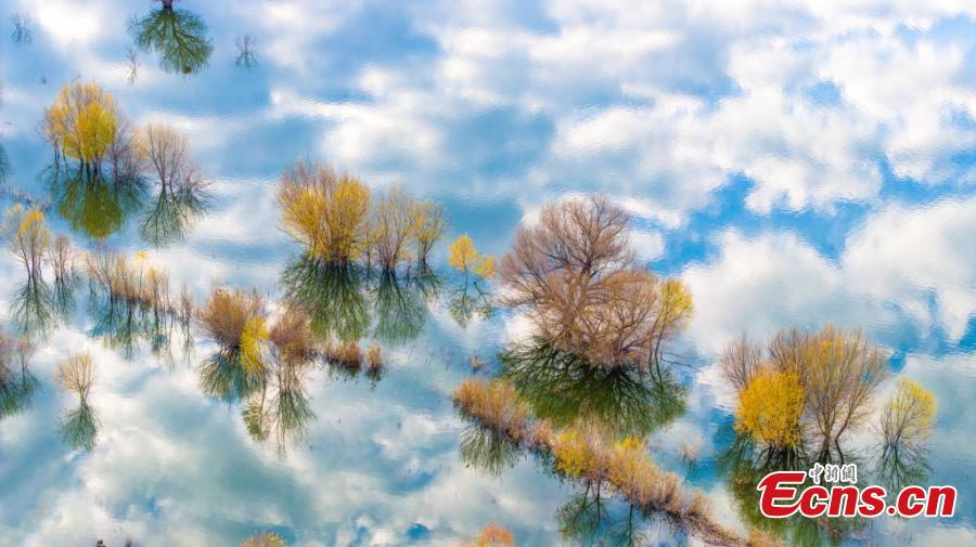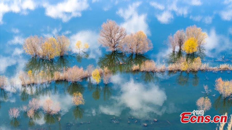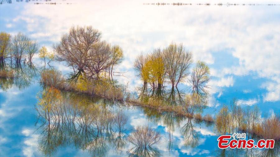 Blue sky and clouds are reflected on the mirror-like Hasuhai Lake in Hohhot City, north China's Inner Mongolia Autonomous Region. (Photo: China News Service/Le Yan)