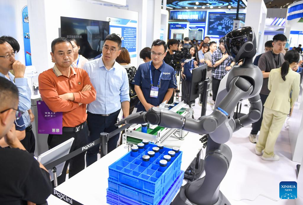 A visitor learns about a robot at a booth at the 26th China High-Tech Fair (CHTF) in Shenzhen, south China's Guangdong Province, Nov. 15, 2024. A variety of robots and products of related industries are exhibited at the ongoing 26th CHTF, attracting lots of attention. (Xinhua/Mao Siqian)