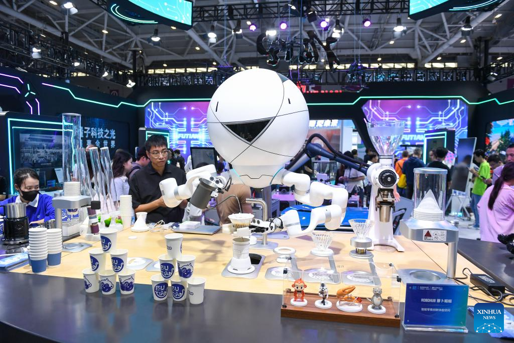 A robot makes coffee at a booth at the 26th China High-Tech Fair (CHTF) in Shenzhen, south China's Guangdong Province, Nov. 14, 2024. A variety of robots and products of related industries are exhibited at the ongoing 26th CHTF, attracting lots of attention. (Xinhua/Mao Siqian)