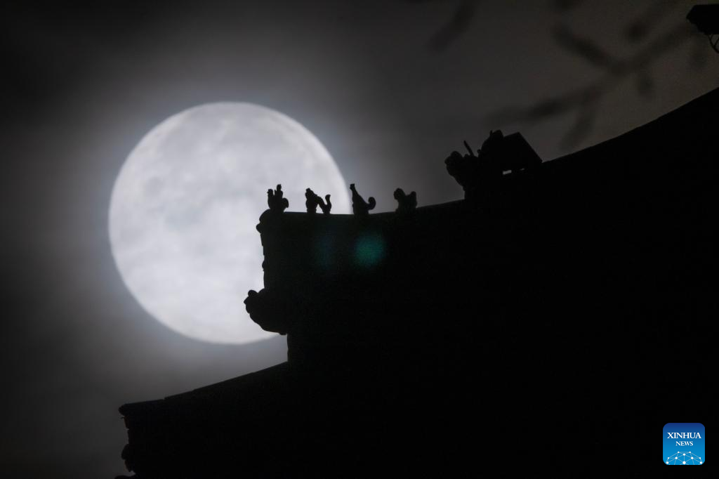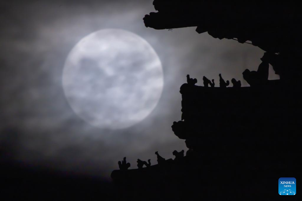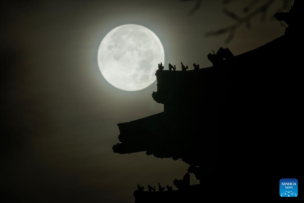 This photo taken on Nov. 16, 2024 shows the full moon over the sky in the Longsha Park of Qiqihar, northeast China's Heilongjiang Province. (Photo by Wang Yonggang/Xinhua)