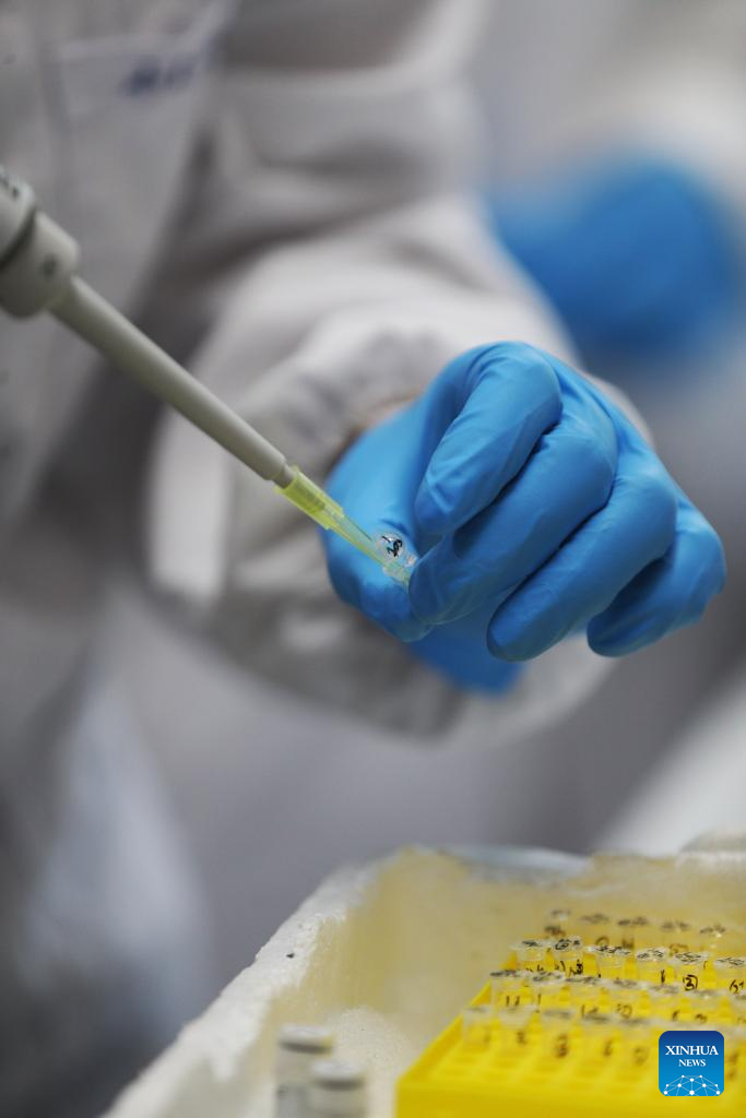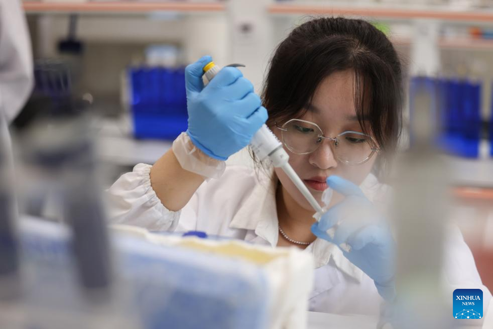 Wang He works in a laboratory of Shanghai Ocean University in east China's Shanghai, Nov. 14, 2024. (Xinhua/Fang Xin)