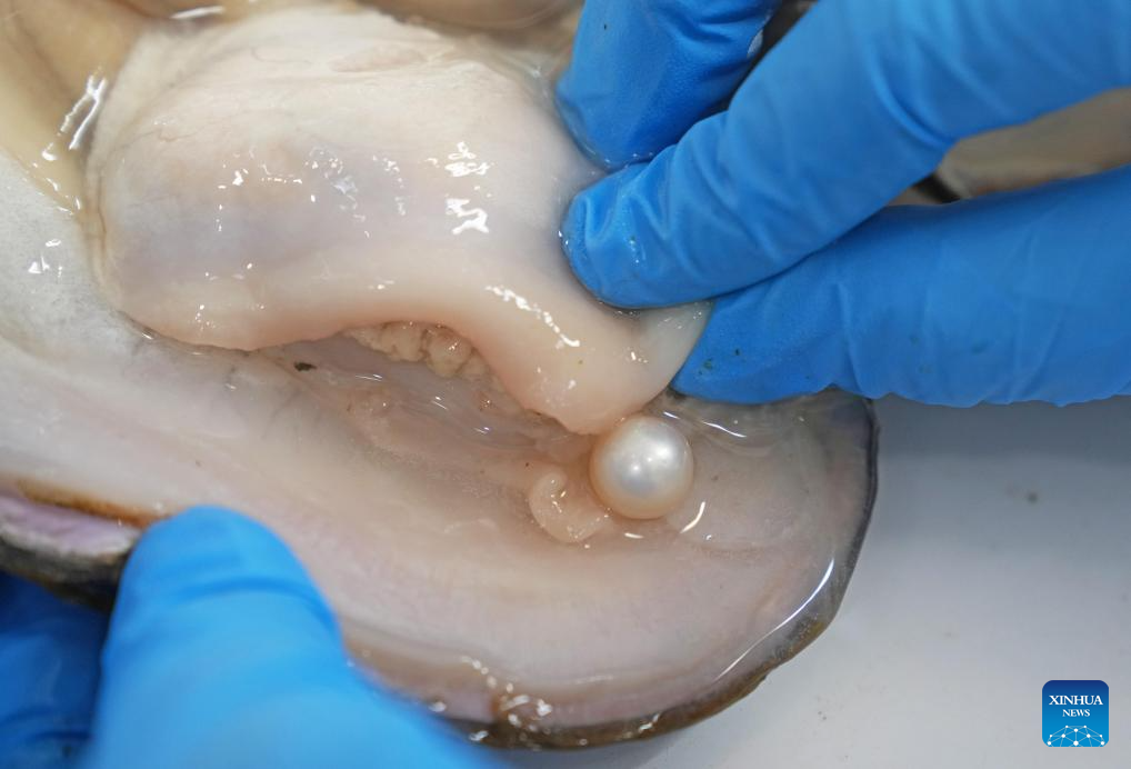 A pearl is taken out of a mussel in a laboratory of Shanghai Ocean University in east China's Shanghai, Nov. 14, 2024. (Xinhua/Liu Ying)