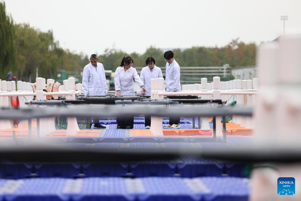 Wang He (C) and Professor Bai Zhiyi (L) observe an experiment in a laboratory of Shanghai Ocean University in east China's Shanghai, Nov. 14, 2024. (Xinhua/Liu Ying)
