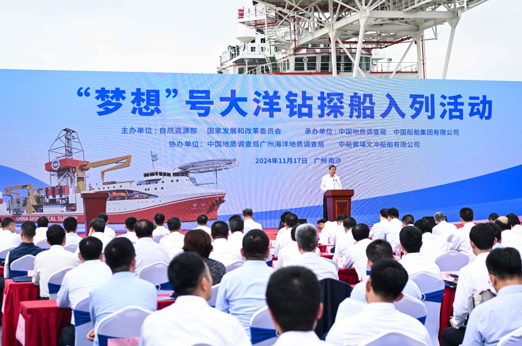 Chinese Vice Premier He Lifeng, also a member of the Political Bureau of the Communist Party of China (CPC) Central Committee, attends the official commissioning of the country's first domestically designed and built deep-ocean drilling vessel Meng Xiang in Guangzhou, south China's Guangdong Province, Nov. 17, 2024. Chinese President Xi Jinping, also general secretary of the CPC Central Committee and chairman of the Central Military Commission, sent a congratulatory letter for the event.