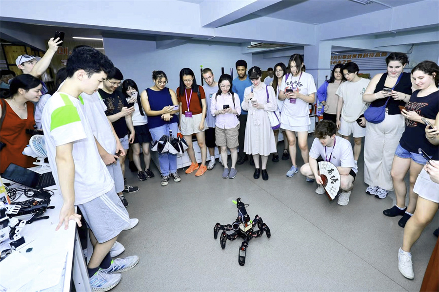 Participants in a Sino-foreign youth dialogue event take time out to interact with a robot in Hangzhou, Zhejiang province, in August. [Photo/Xinhua]