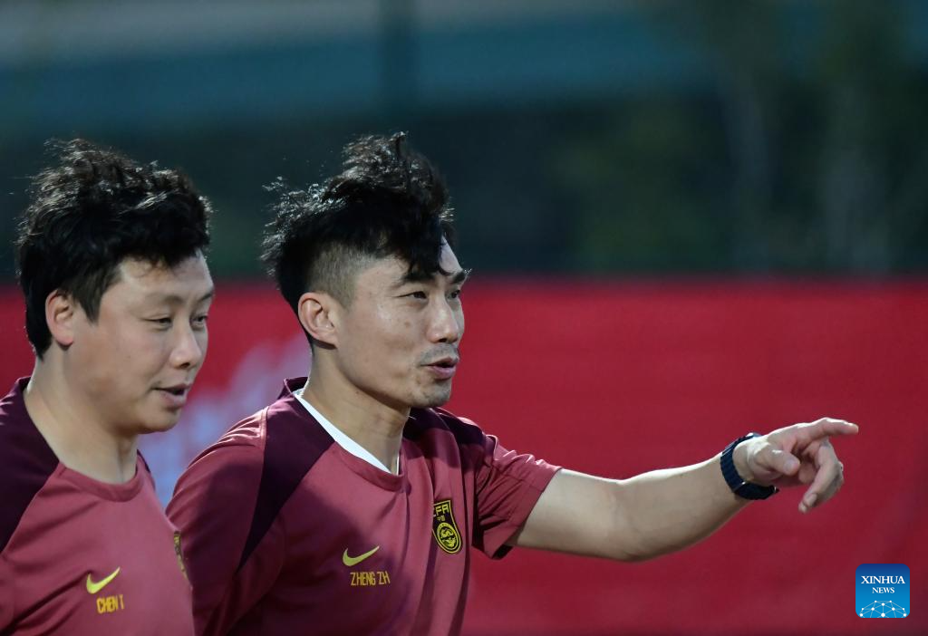 Zheng Zhi (R), assistant coach of the Chinese national men's football team, reacts during a training session for the upcoming 2026 FIFA World Cup Asian Qualifiers match between China and Japan in Xiamen, east China's Fujian Province, Nov. 17, 2024. (Xinhua/Wei Peiquan)