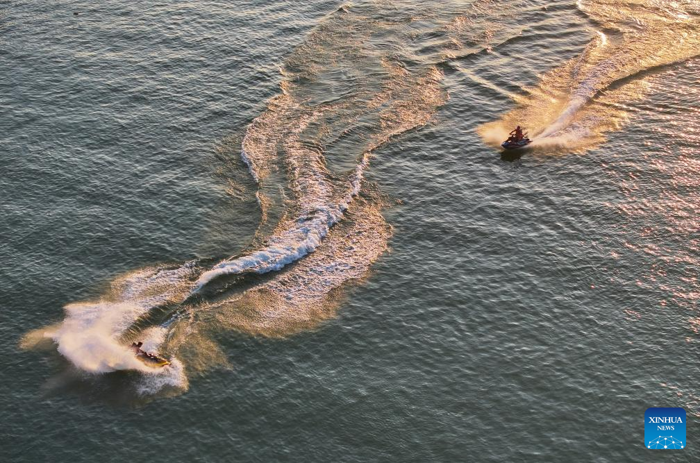 An aerial drone photo taken on Nov. 13, 2024 shows tourists riding motorboats in the Xijiang River in Sizhou Village in Changzhou District of Wuzhou City, south China's Guangxi Zhuang Autonomous Region. Located on the Sizhou Island in Xijiang River and bestowed with rich intangible cultural heritage and beautiful natural scenery, Sizhou Village has become a famous tourism attraction.
