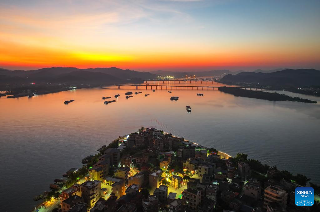 An aerial drone photo taken on Nov. 15, 2024 shows the scenery at sunset near Sizhou Village in Changzhou District of Wuzhou City, south China's Guangxi Zhuang Autonomous Region. Located on the Sizhou Island in Xijiang River and bestowed with rich intangible cultural heritage and beautiful natural scenery, Sizhou Village has become a famous tourism attraction.