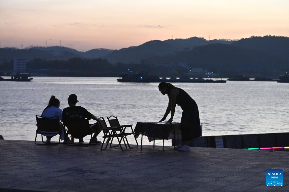 Tourists enjoy the sunset scenery at Sizhou Village in Changzhou District of Wuzhou City, south China's Guangxi Zhuang Autonomous Region, Nov. 14, 2024. Located on the Sizhou Island in Xijiang River and bestowed with rich intangible cultural heritage and beautiful natural scenery, Sizhou Village has become a famous tourism attraction.