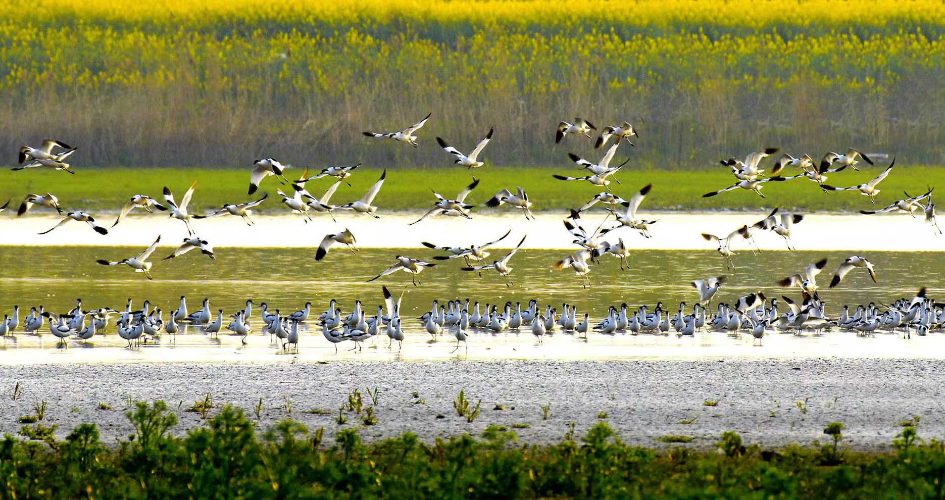 At East Dongting Lake, autumn unveils a unique charm. The lake mirrors the vast sky, while flocks of migratory birds soar and rest above, bringing vibrancy to the water.