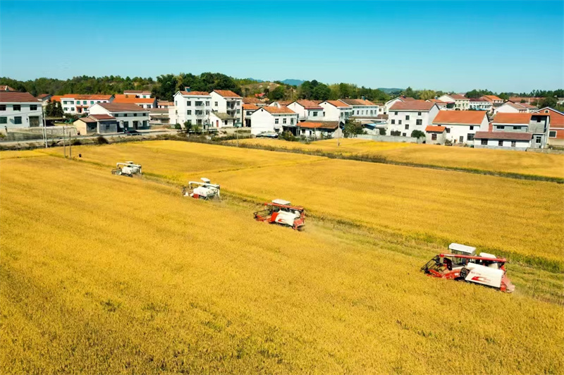 This photo shows the bountiful late-season rice harvest at the Xidong Agricultural Machinery Cooperative in Yueyang county. (Photo/Xu Weijun)