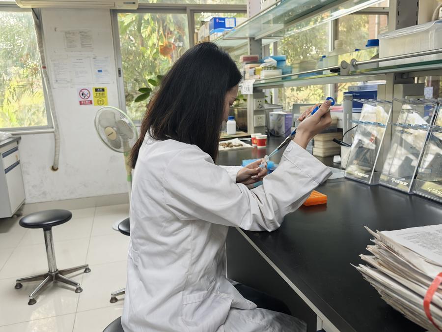Liu Lu, a PhD researcher of the Chinese Academy of Sciences, conducts a molecular experiment in the laboratory of South China Botanical Garden of the Chinese Academy of Sciences in Guangzhou, South China' Guangdong Province, on Nov. 11, 2024. (Xinhua)