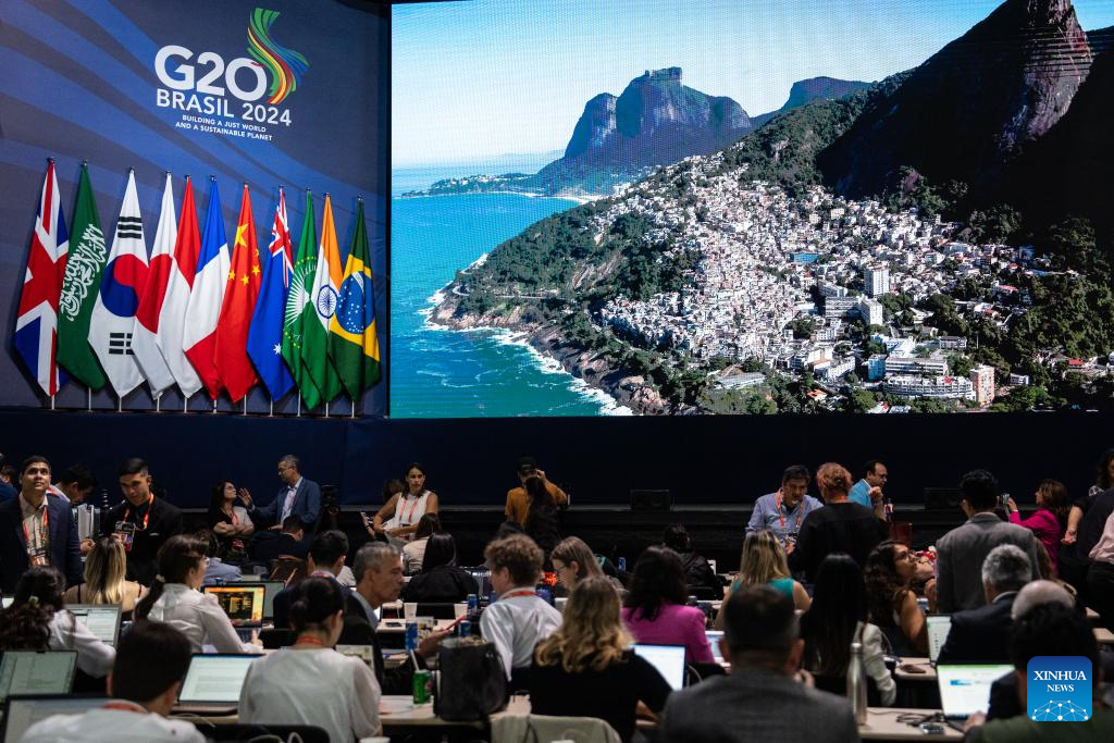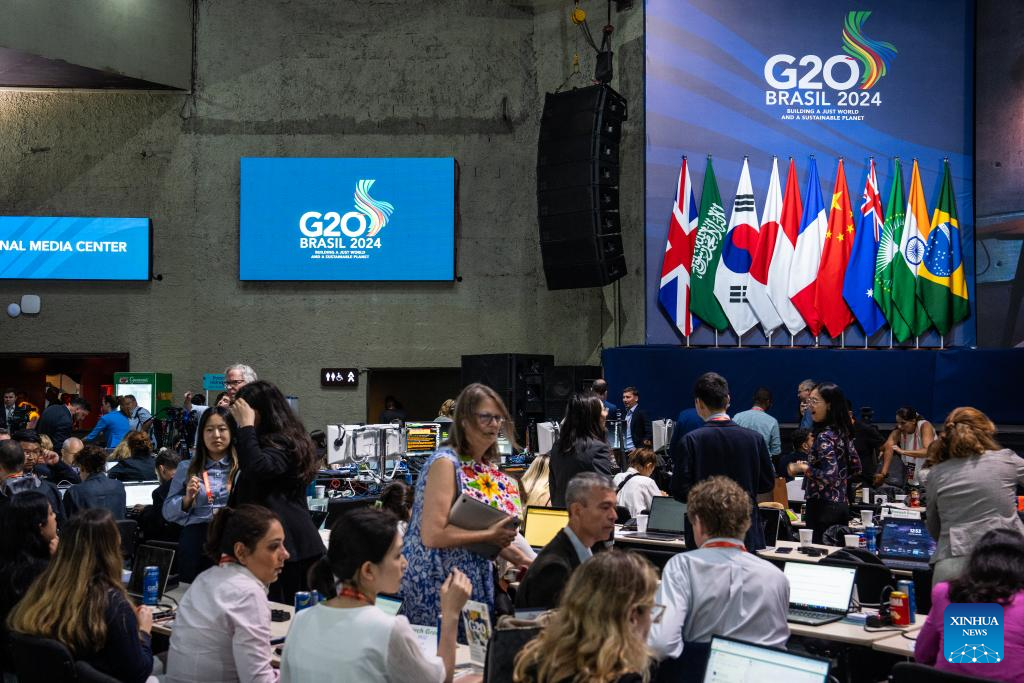 Journalists work at the International Media Center for the 19th G20 Summit in Rio de Janeiro, Brazil, Nov. 18, 2024. (Xinhua/Wang Tiancong)