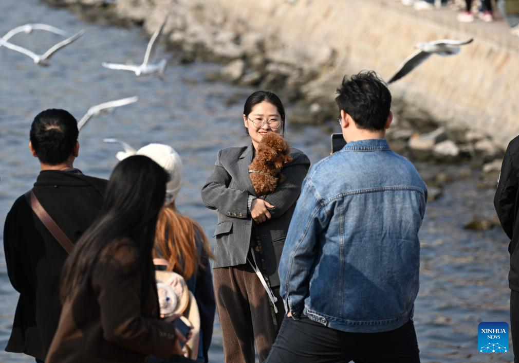 People view seagulls by the Haihe River in north China's Tianjin Municipality, Nov. 19, 2024. Thousands of seagulls have recently flocked to an obsolete dock by the Haihe River, turning it into a tourist attraction. (Xinhua/Zhao Zishuo)