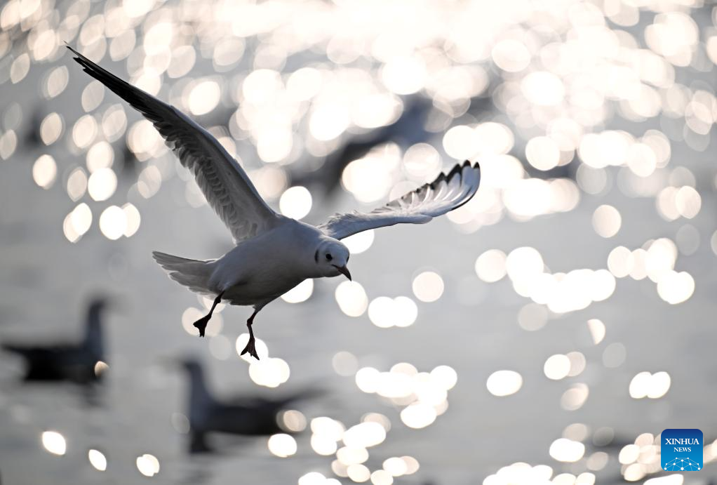 A seagull flies above the Haihe River in north China's Tianjin Municipality, Nov. 19, 2024. Thousands of seagulls have recently flocked to an obsolete dock by the Haihe River, turning it into a tourist attraction. (Xinhua/Zhao Zishuo)