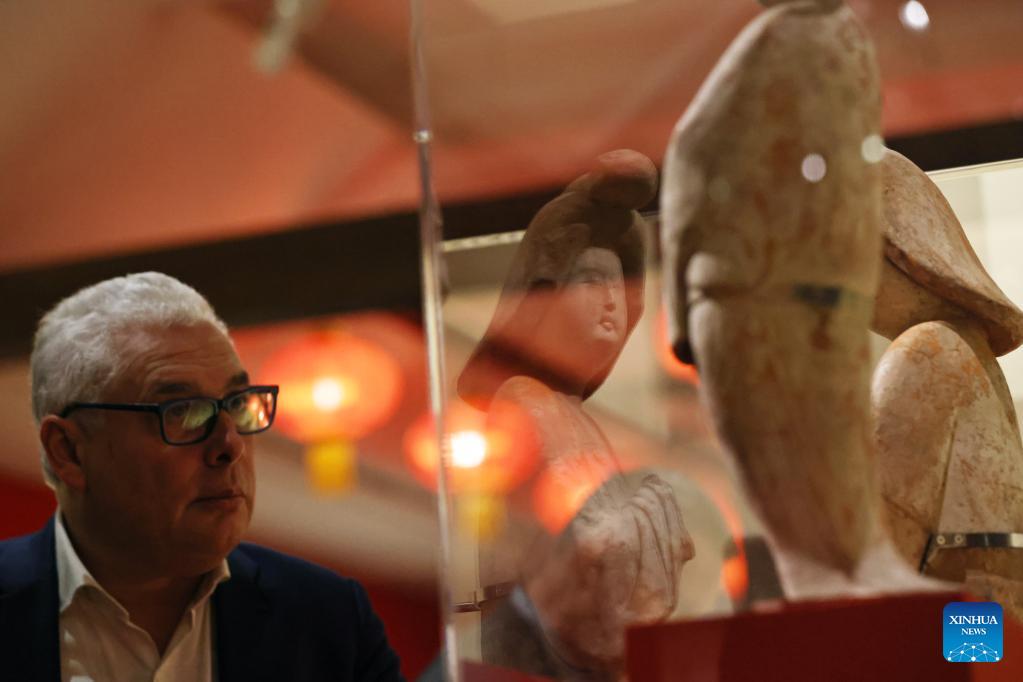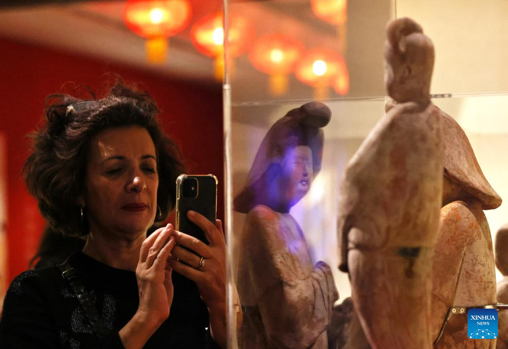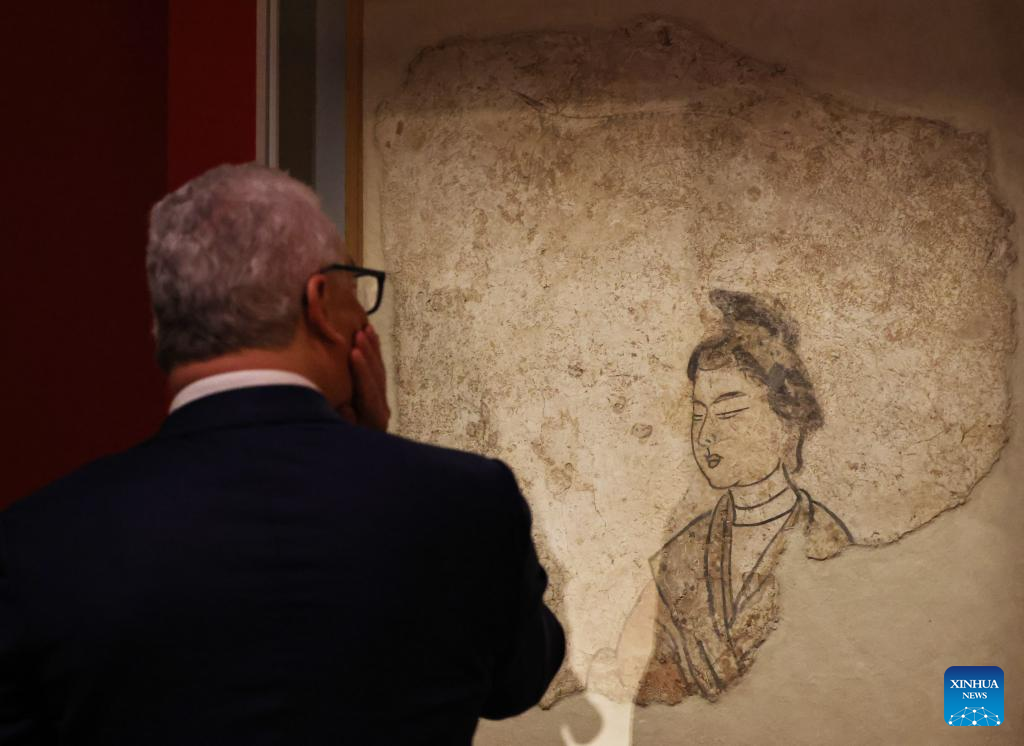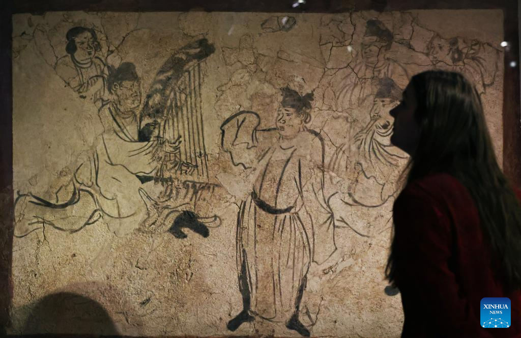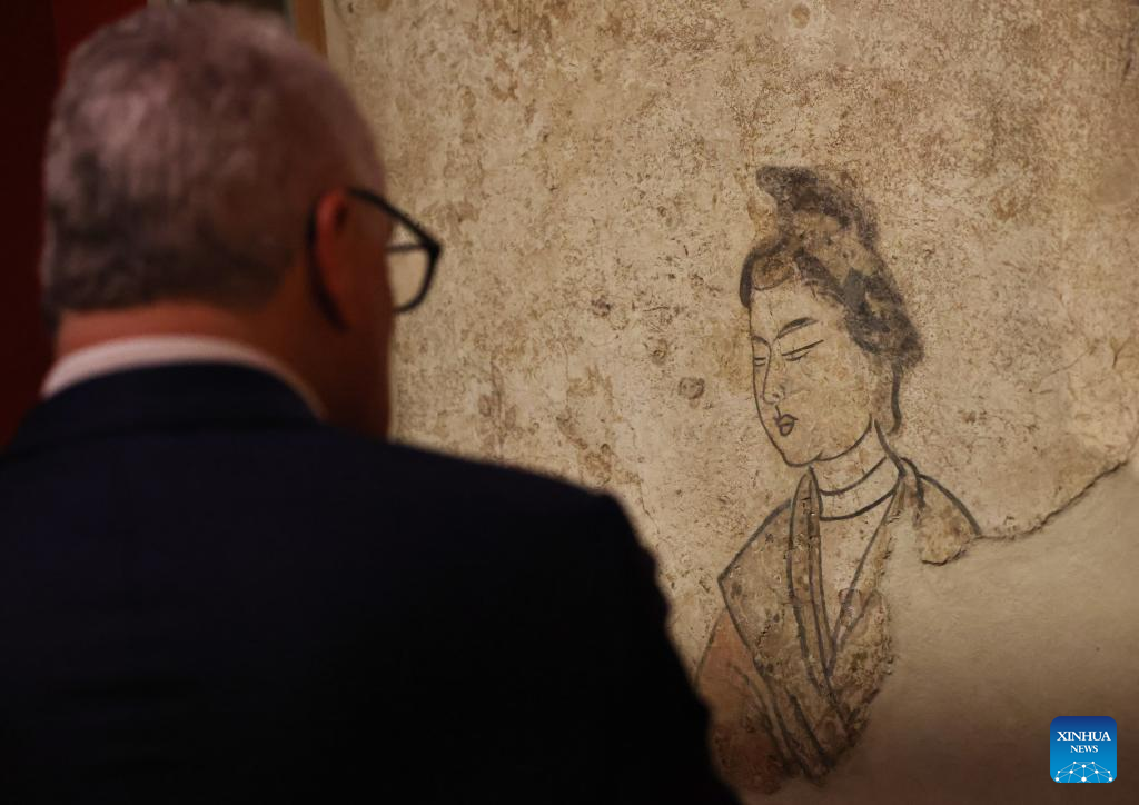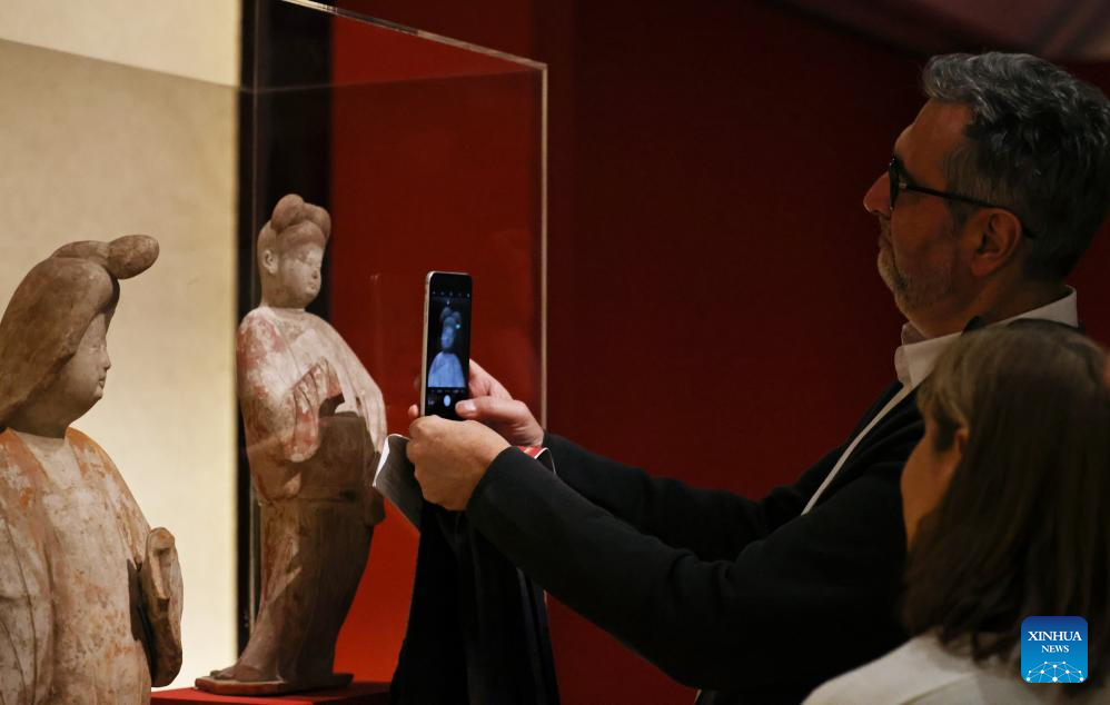 A visitor is pictured at an exhibition titled "Tang China -- A Cosmopolitan Dynasty (7th-10th Century)" at the Guimet National Museum of Asian Arts in Paris, France, Nov. 18, 2024. The exhibition was inaugurated Monday at France's Guimet National Museum of Asian Arts.