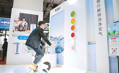A visitor tests a product in the consumer goods exhibition area at the seventh China International Import Expo in Shanghai. (Xinhua/Jin Mamengni)