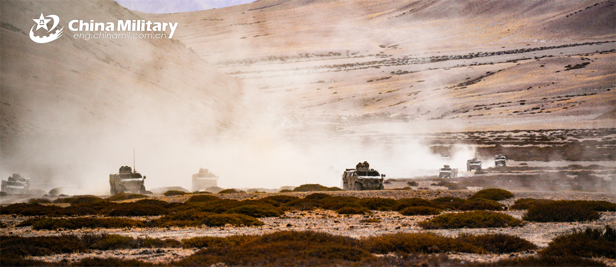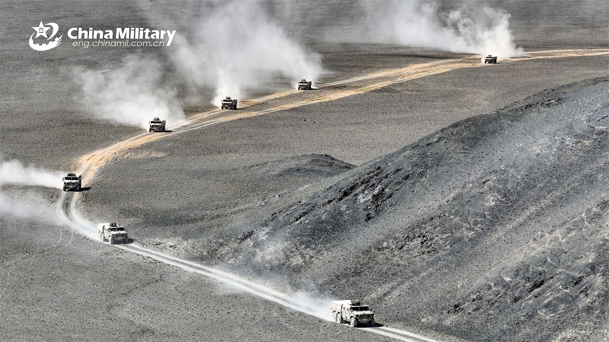 A fleet of military vehicles attached to the Chinese PLA Xinjiang Military Command maneuver to the designated area for tactical coordination training. (eng.chinamil.com.cn/Photo by Yu Shijie)