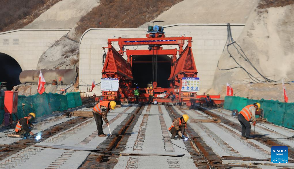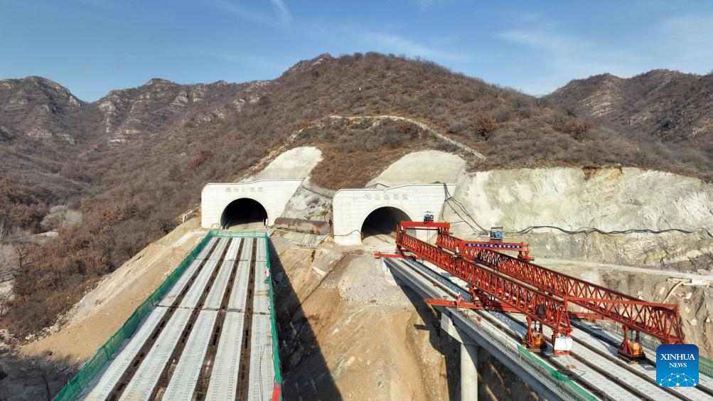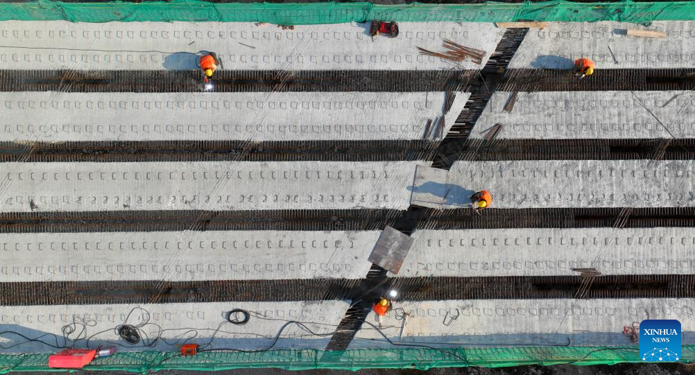 People work on a bridge of the Lingyuan-Suizhong expressway in northeast China's Liaoning Province, Nov. 19, 2024. The expressway linking the counties of Lingyuan and Suizhong both in Liaoning, when completed, will be a new passage to the sea for the western part of the province. (Xinhua/Yang Qing)